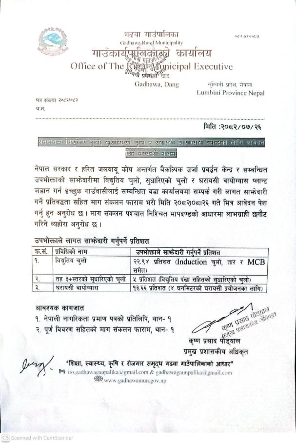 अनुदानमा विधुतिय चुलो सुधारिएको चुलो र घरायसी बायोग्यास प्लान्टको लागि आवेदन दिने सम्बन्धमा।
