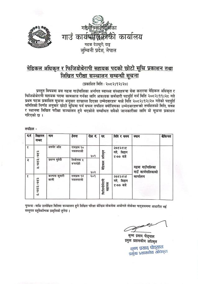मेडिकल अधिकृत र फिजियोथेरापि सहायक पदको छोटो सूचि प्रकाशन तथा लिखित परिक्षा सन्चालन सम्बन्धि सूचना।