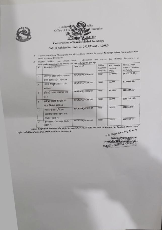 नदिजन्य पदार्थ विक्रि ब्यवस्थापन सम्बन्धि विधुतिय बोलपत्र आह्वानको सुचना।
