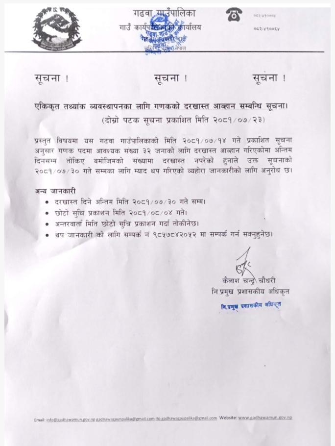 एकिकृत तथ्यांक ब्यबस्थापनका लागि गणकको दोस्रो पटक दरखास्त आहवान सम्बन्धि सूचना |