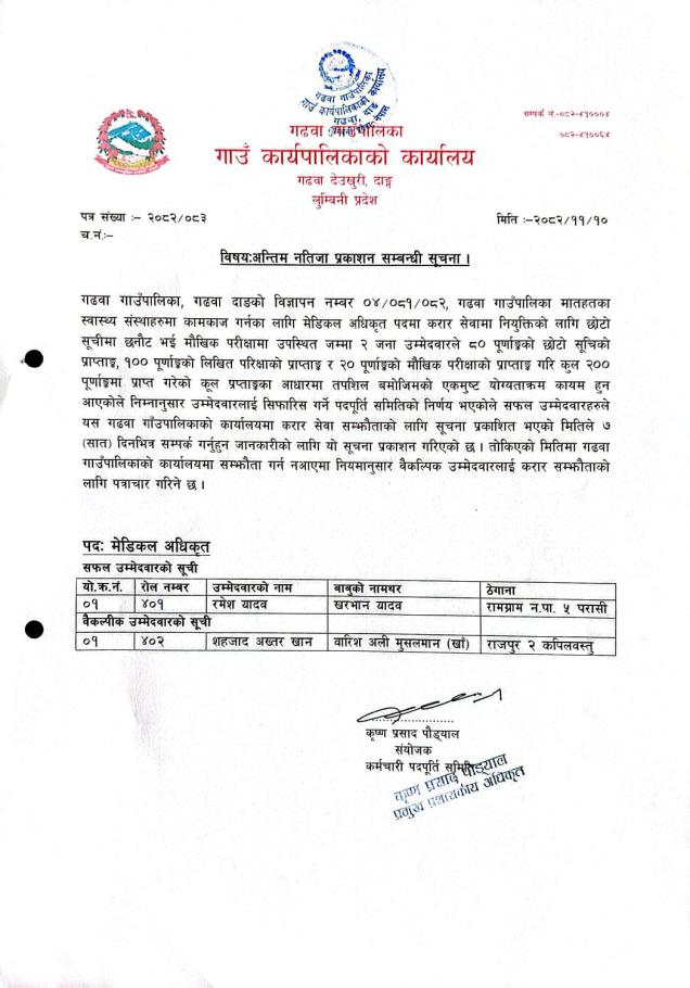 मेडिकल अधिकृत पदको अन्तिम नतिजा प्रकाशन सम्बन्धि सूचना।