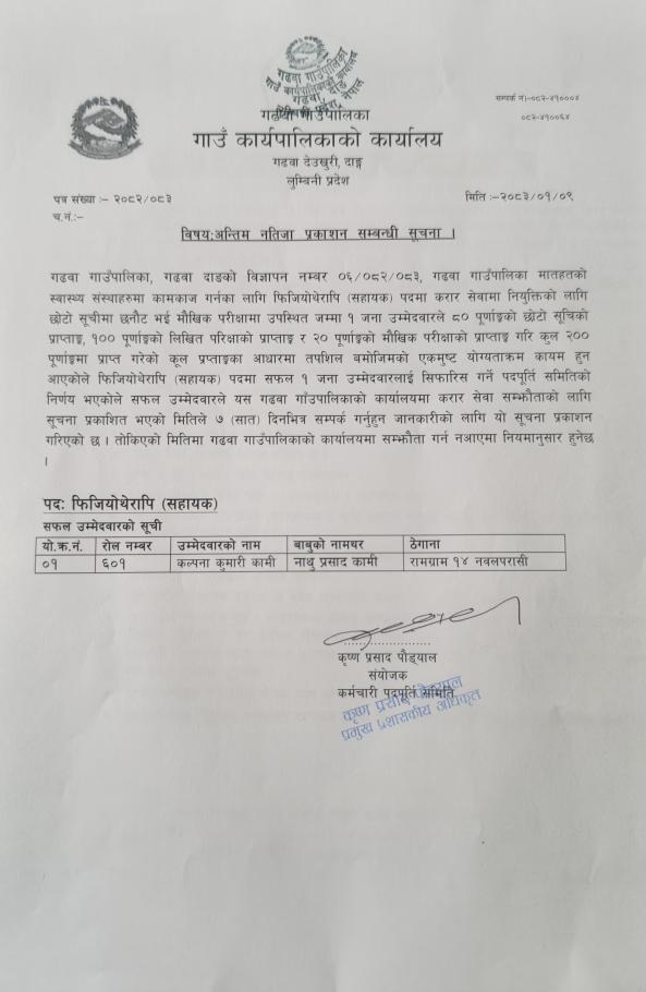 मेडिकल अधिकृत पदको अन्तिम नतिजा प्रकाशन सम्बन्धि सूचना।